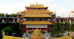 Visitors to Vajra Vidya are welcomed by a bas-relief mural of the four great kings, the guardians of the four directions, just inside the monastery gate. The gate itself is designed as a Chakrasamvara mandala. Facing the main temple building are statues of Brahma and Indra, the gods who requested Shakyamuni Buddha to teach the Dharma after his enlightenment.